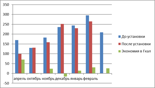 Как видно из таблицы и гистограммы, после установки теплорегулирующих гидроэлеваторов, потребление снизилось на 146,13 Гкал, что в денежном выражении, при стоимости 2 912 руб. за 1 Гкал, составило 425 530 руб.